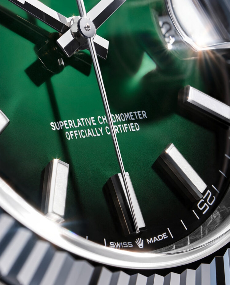 This is where the replica watches UK earn their place in the 2026 catalog. The green lacquer ombre dial is a first for Rolex in this execution: colored entirely by lacquering, with green applied to the base plate and black lacquer sprayed in concentric motions to create the gradient. The result is a deep, rich green at the center that darkens progressively toward the edge, with the white dial inscriptions reading exceptionally clearly against it. Paired with the white gold fluted bezel, the contrast is sharp and elegant without being loud. The hour markers are in 18ct white gold with Chromalight luminescence, as are the hour and minute hands. It is a strong dial, and it will absolutely shine against that bezel in direct light.